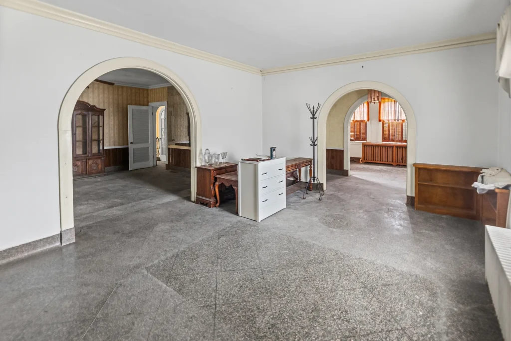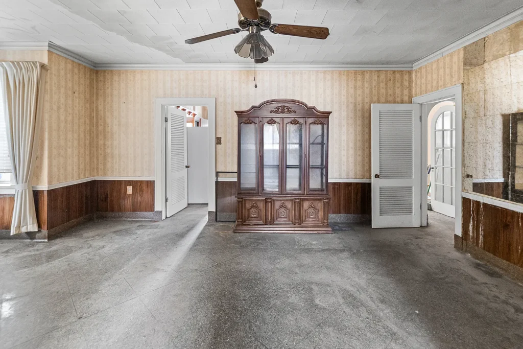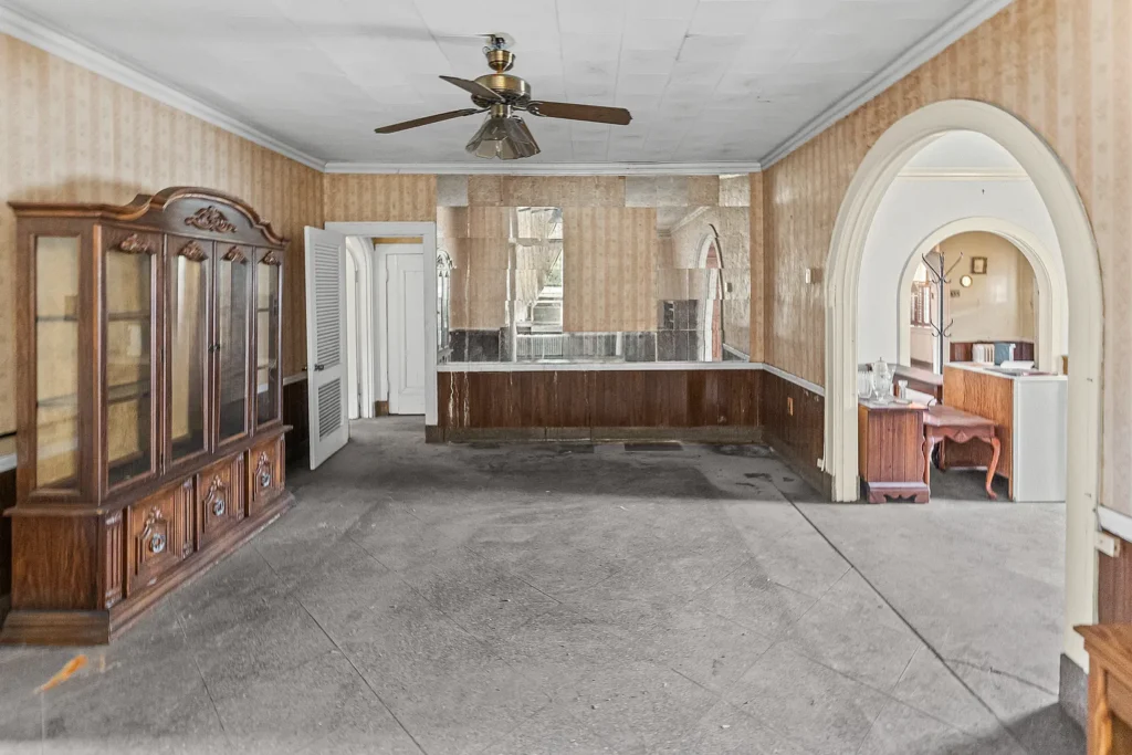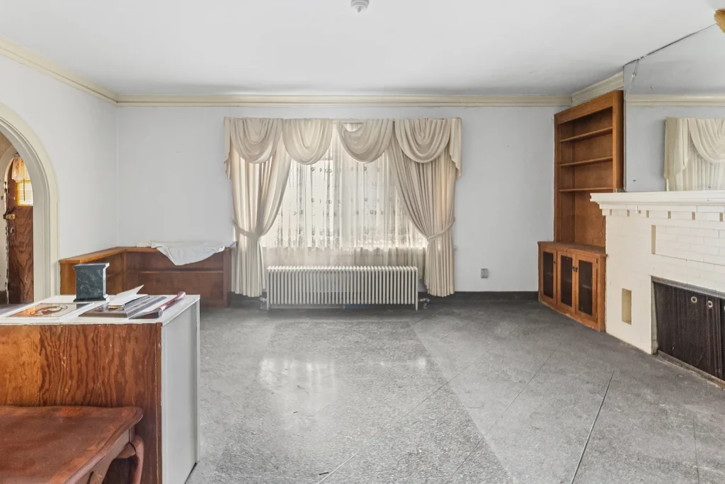 To the left of the foyer sits a comfortable living room, perfect for everyday relaxation or entertaining guests. With the right vision and updates, this space could easily become a bright and airy central gathering place. On the opposite side of the foyer, you’ll find a family room, offering additional living space. Whether used as a media room, playroom, office, or second lounge, this room expands the home’s versatility and enhances its appeal for larger households.