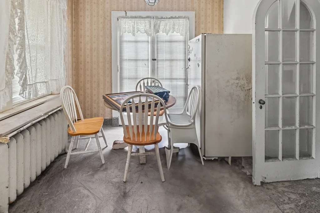 Moving deeper into the main level, the floor plan opens into a large dining room, ideal for hosting meals and special occasions. Its size allows for a full dining set, hutches, or display furniture, making it perfect for those who enjoy family dinners or festive gatherings. Adjacent to the dining area sits the separate kitchen, which features a cozy breakfast nook—a delightful corner for morning coffee, casual meals, or a small workspace. With modern updates, this kitchen could transform into the heart of the home, offering both style and function.