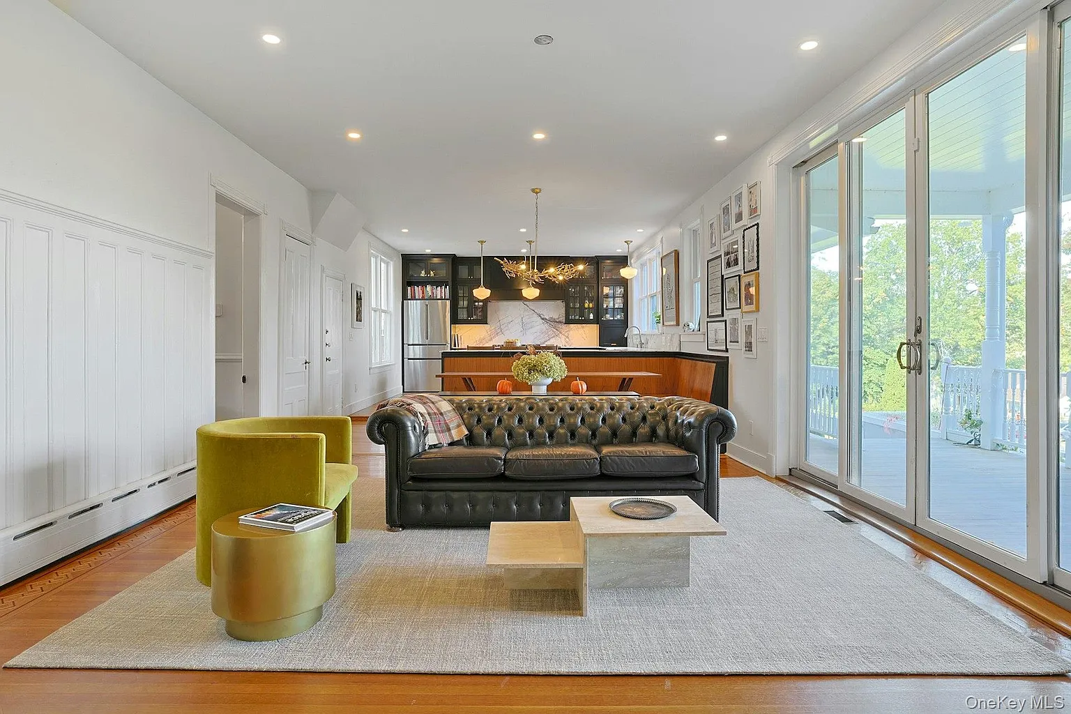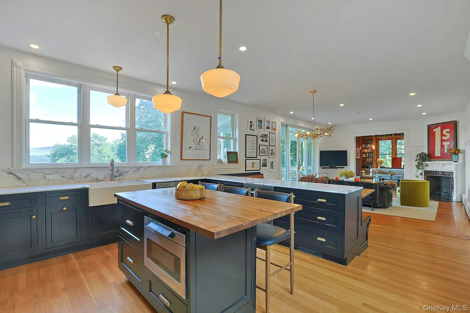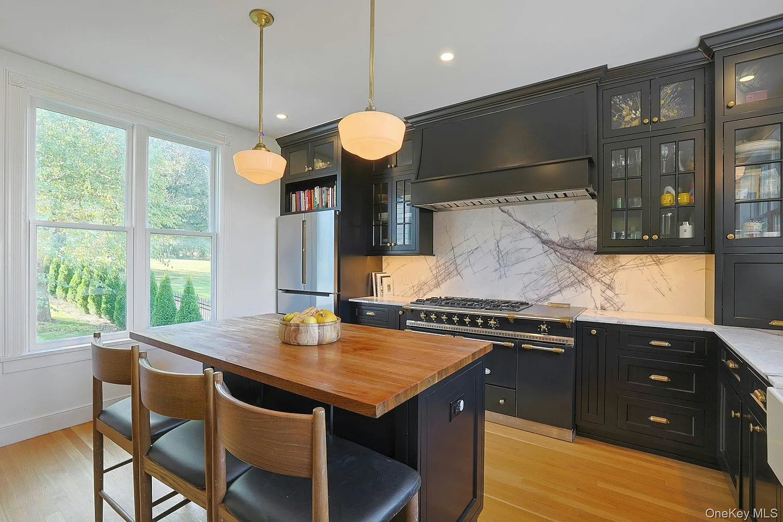 The interior showcases original stained glass, custom wood floors, and a true chef’s kitchen with Lilac Marble and a French LaCanche double oven. The singularly inviting library features custom oak bookshelves and a hidden speakeasy door!